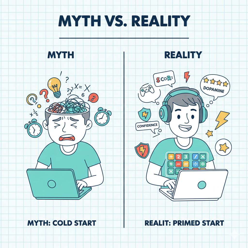 If your calculations are slow, your brain can’t access the concept. Fix the arithmetic load, and the path appears. Before you touch the day’s lesson, you need to build momentum and self-efficacy.