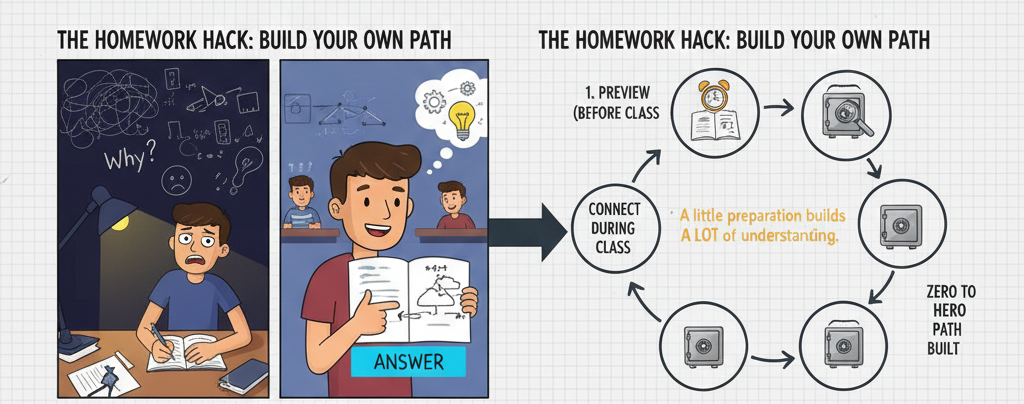 The Method: Prepare your brain ahead of time. Before a new lecture, preview the material. Read the chapter titles and look at the first few examples.