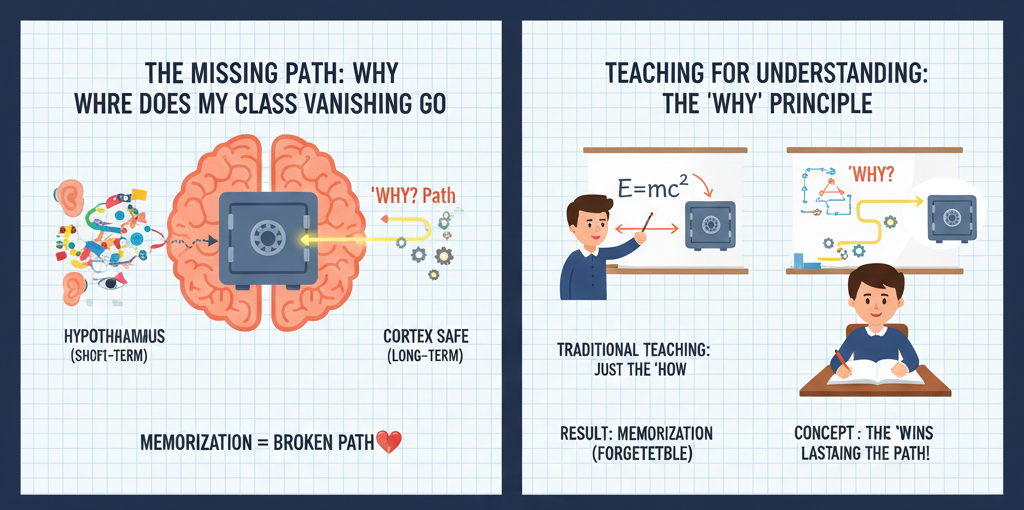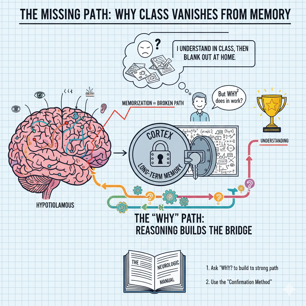 The Science: You caught the information (the pattern) in the immediate processing center (Hypothalamus), but the path to send it to the long-term storage (Cortex ‘Safe’) is missing. The path is built by reasoning, not repetition.